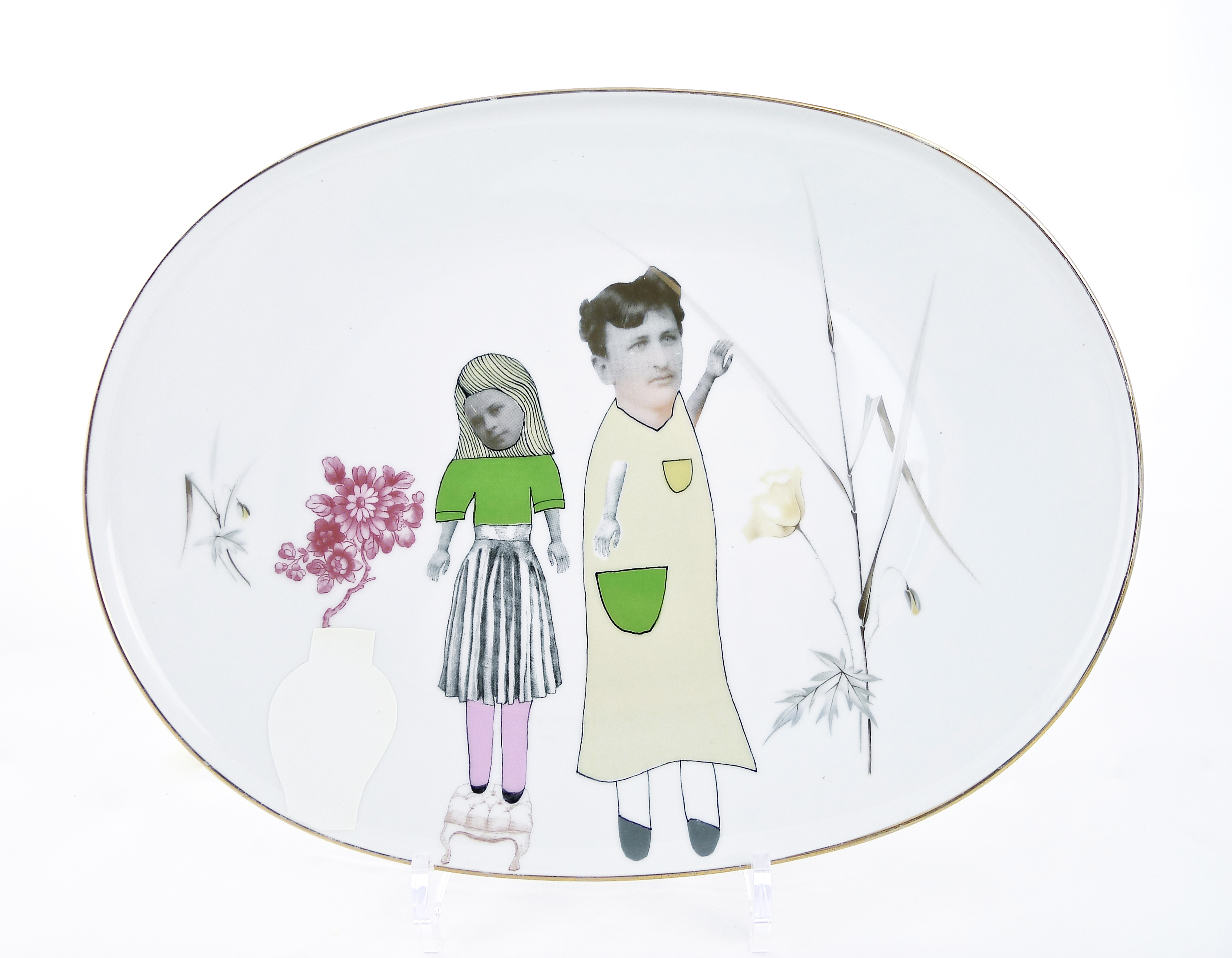 Old porcelain oval platter, golden line on the edge, flower motives, added illustration.