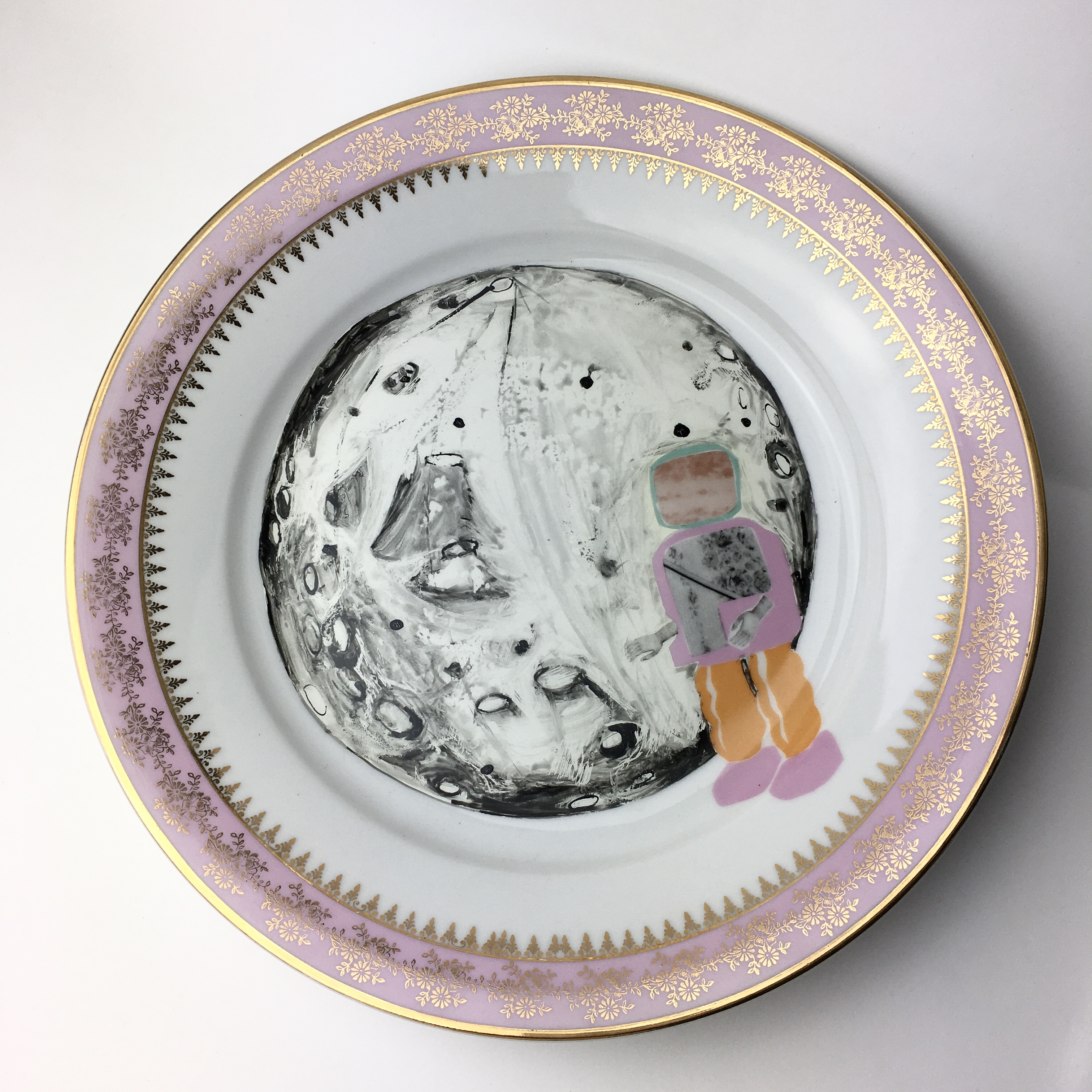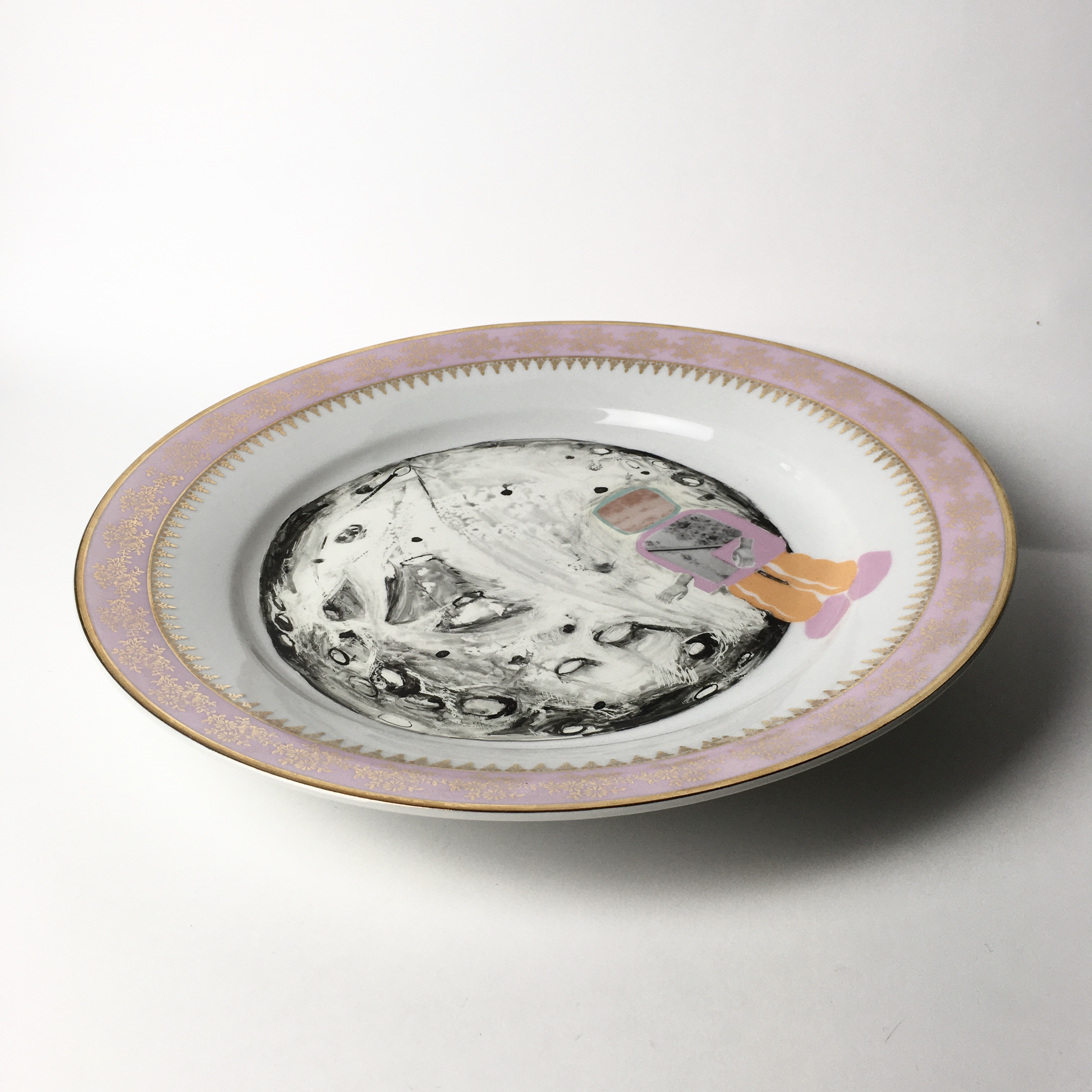 Old serving plate, floral decor, golden trim, painted and collaged.