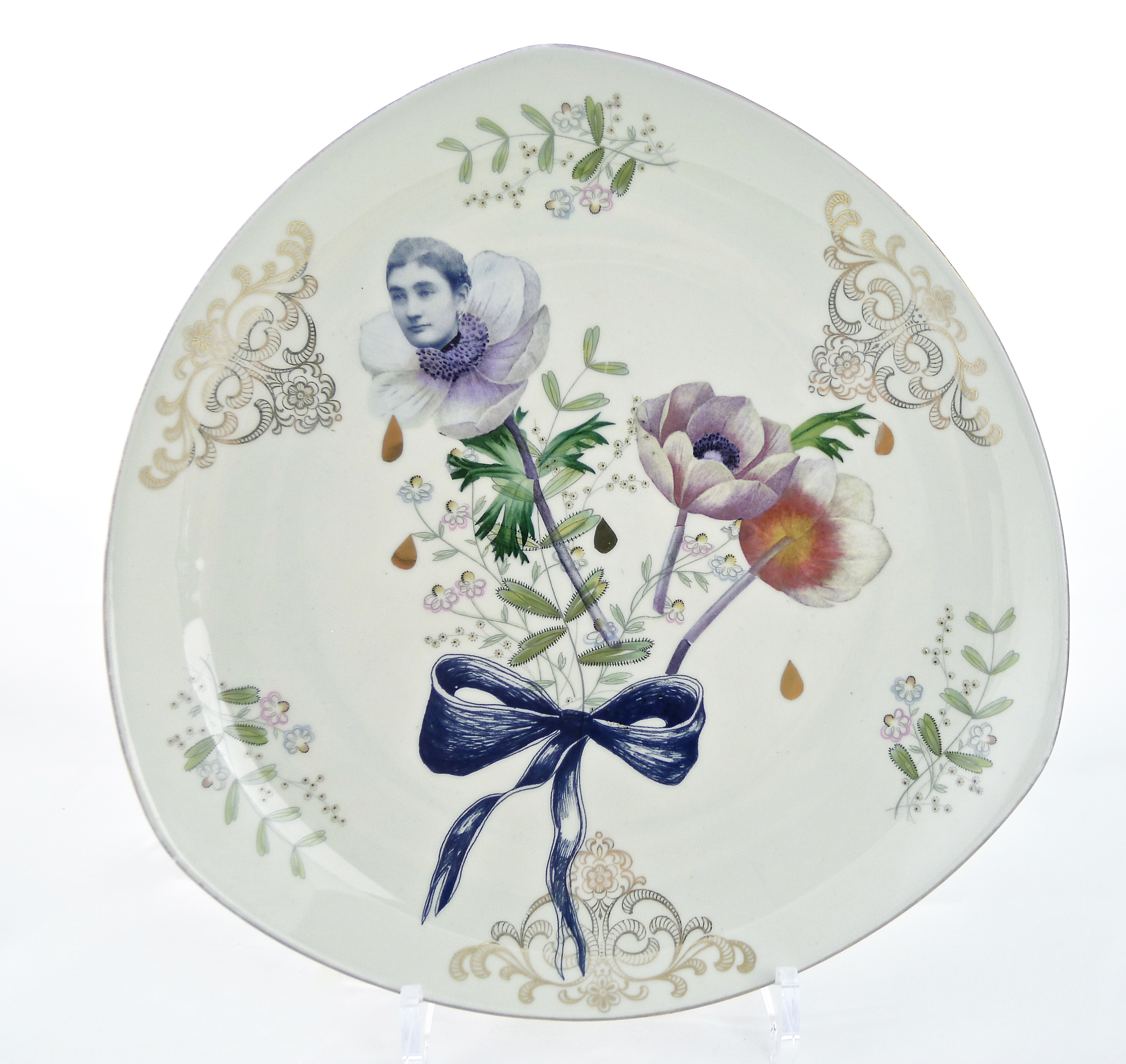 Old servis plate, golden and floral decor, collaged.