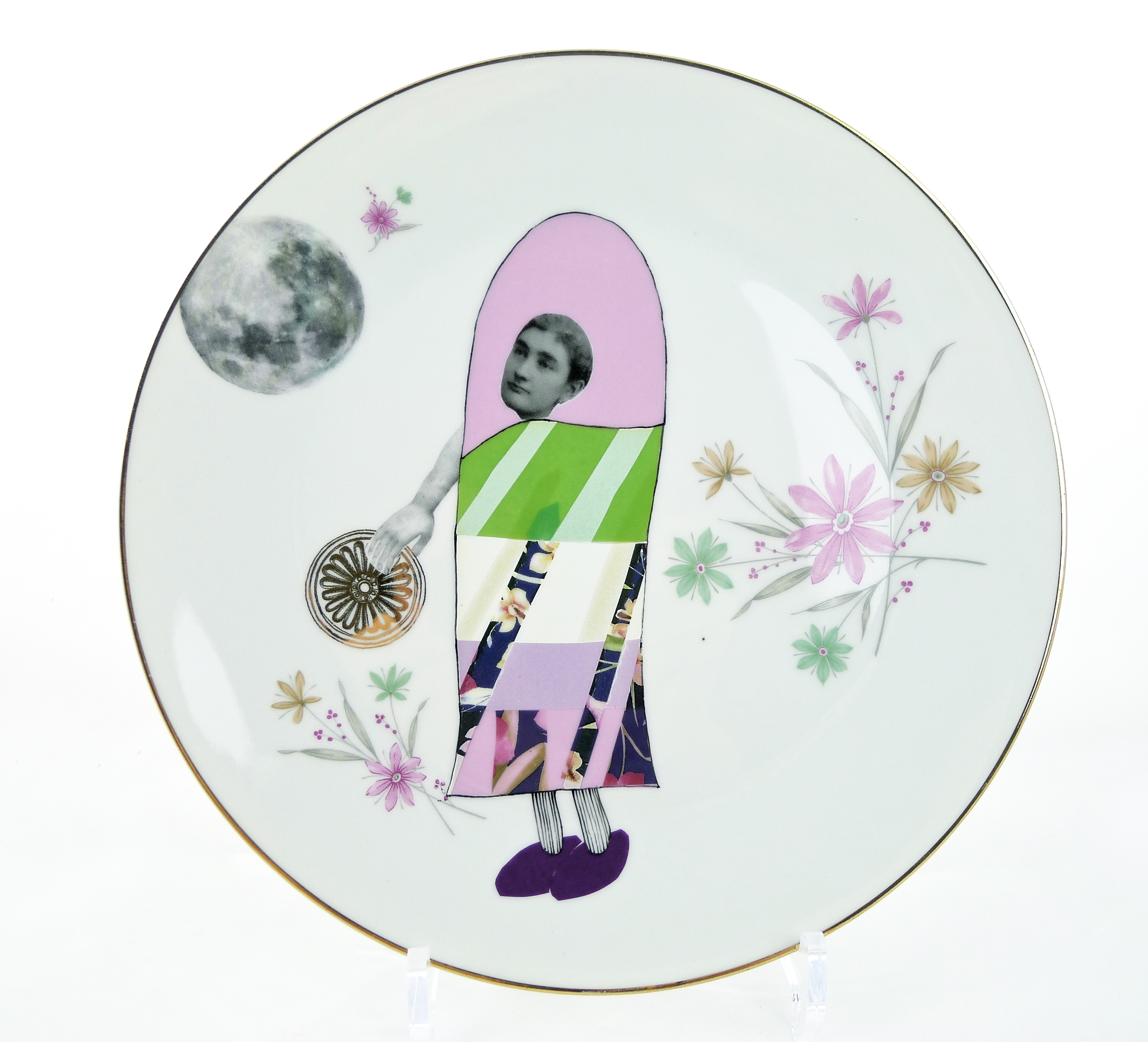 Old servis plate, golden and floral decor, collaged.