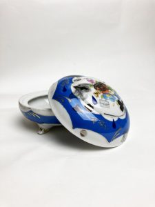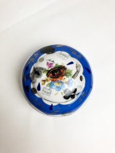 Doze with little legs, and lid. Collaged and illustrated.