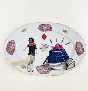 Serving oval. Collaged and illustrated.
