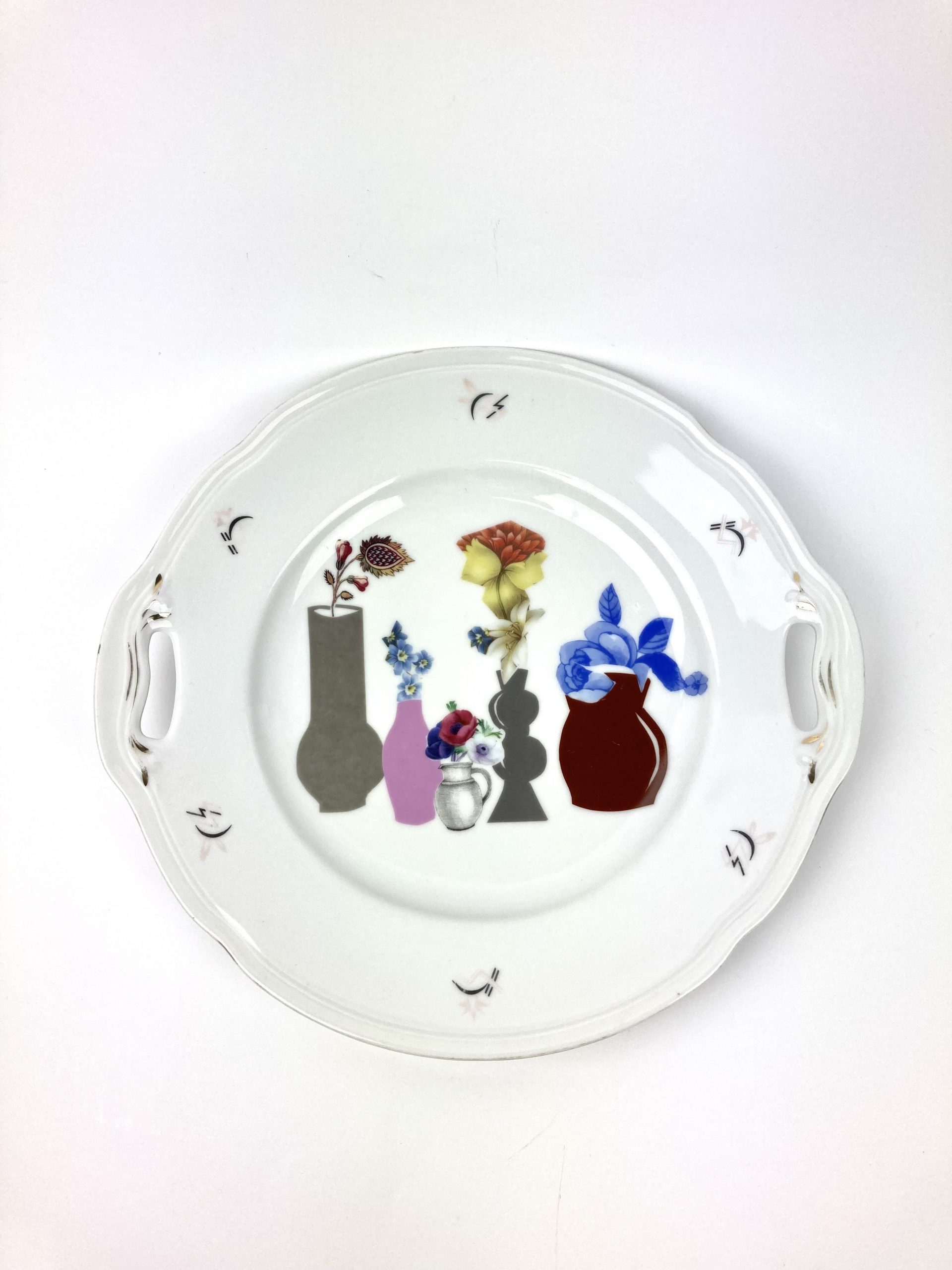 Servin plate with handles. Collaged and illustrated.