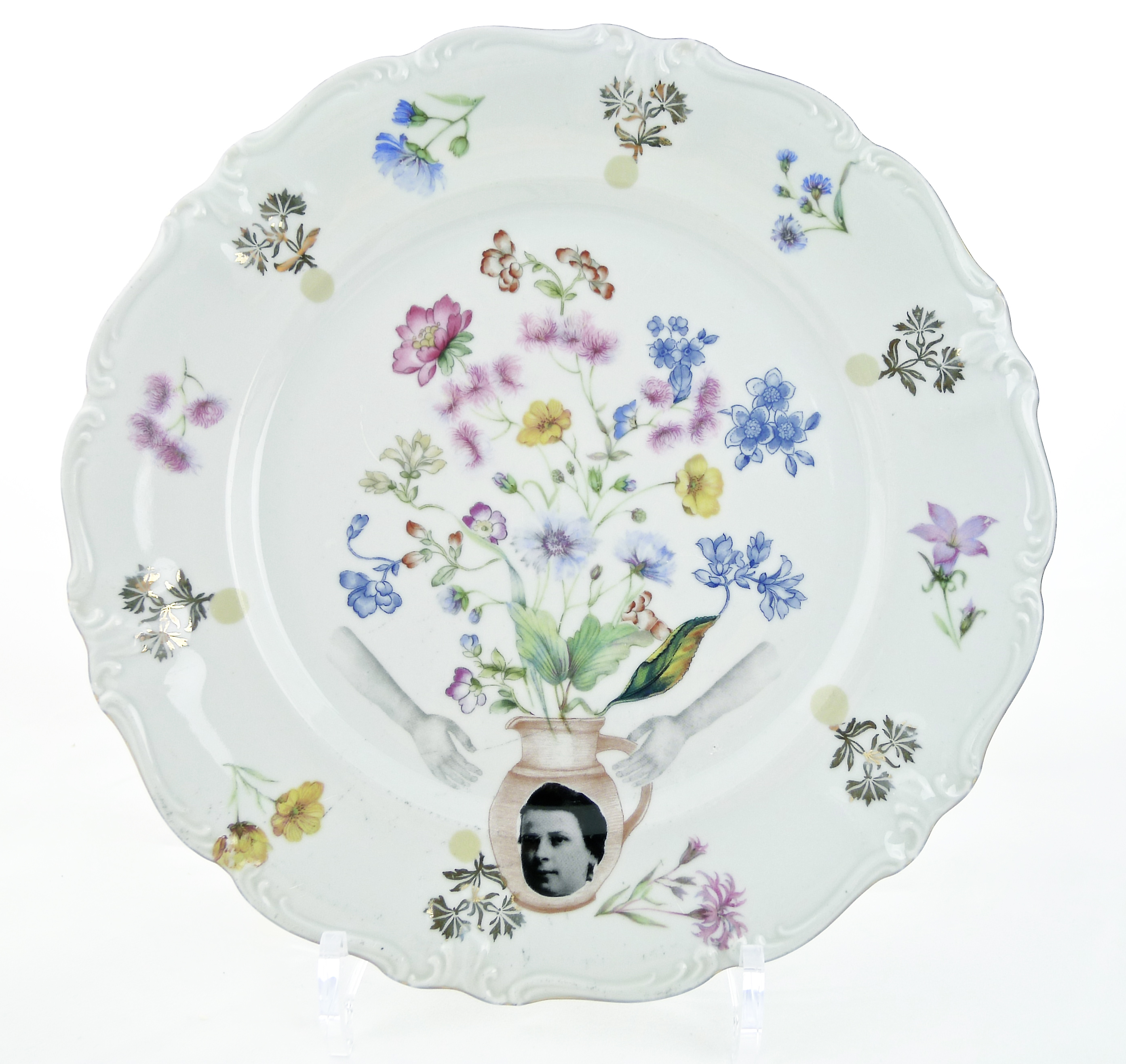 Old servis plate, floral decor, collaged.