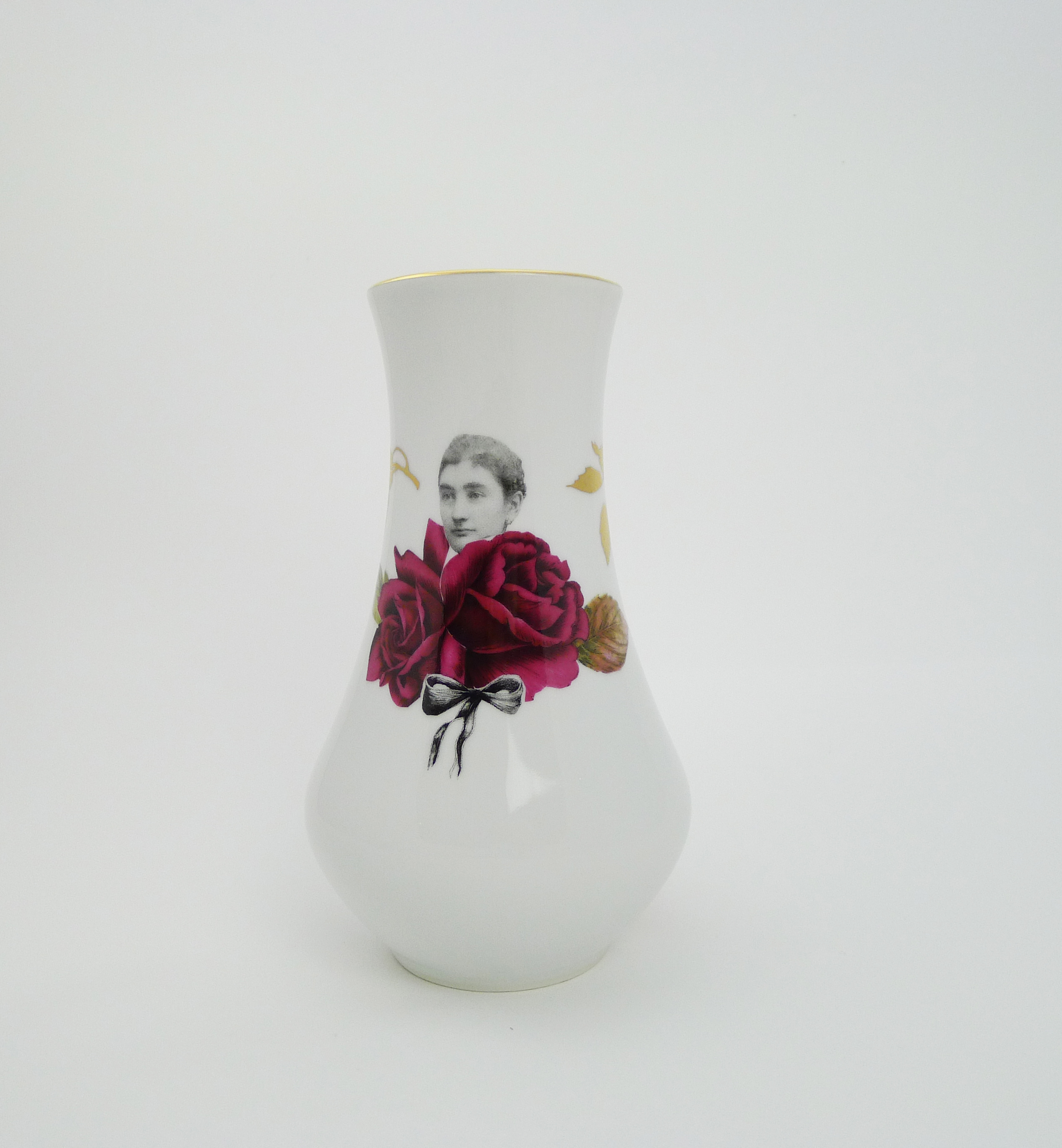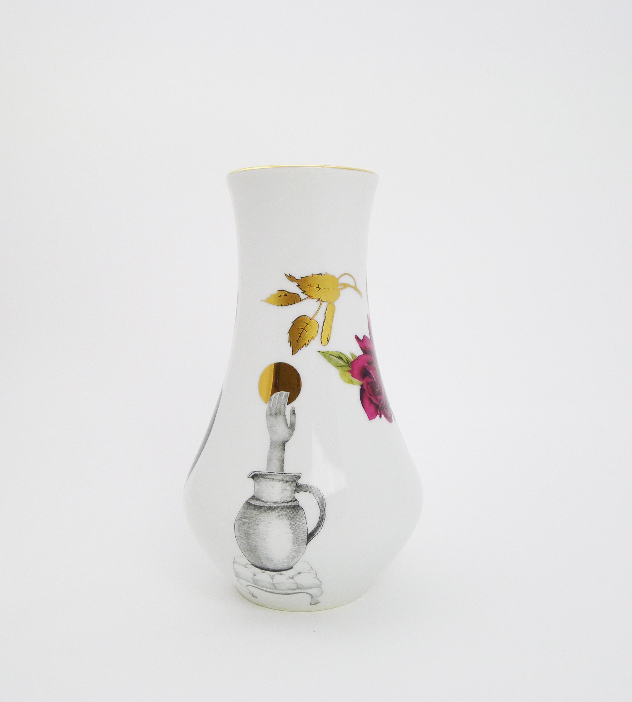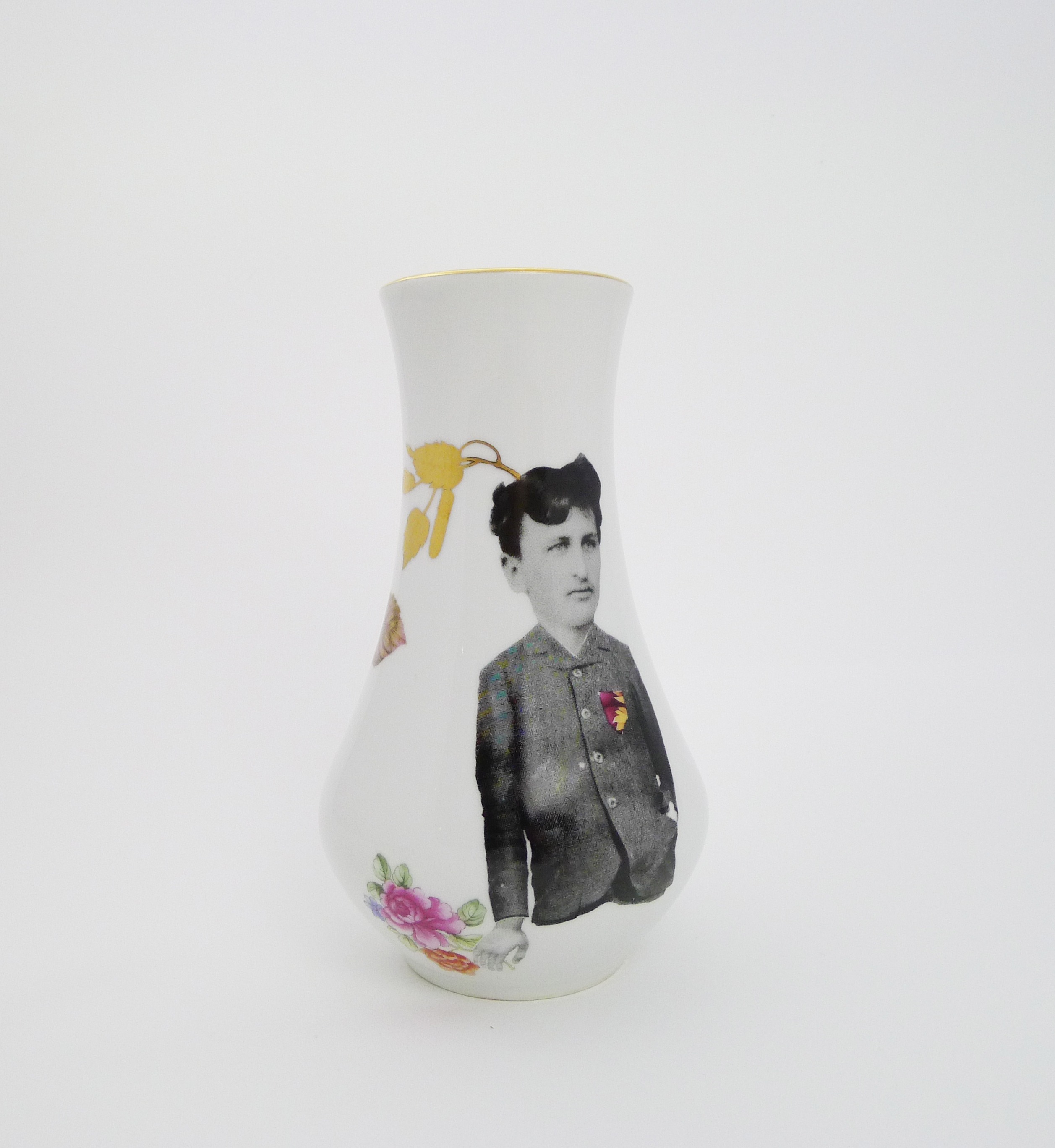 Vase, floral gold decor, collaged and illustrated story.