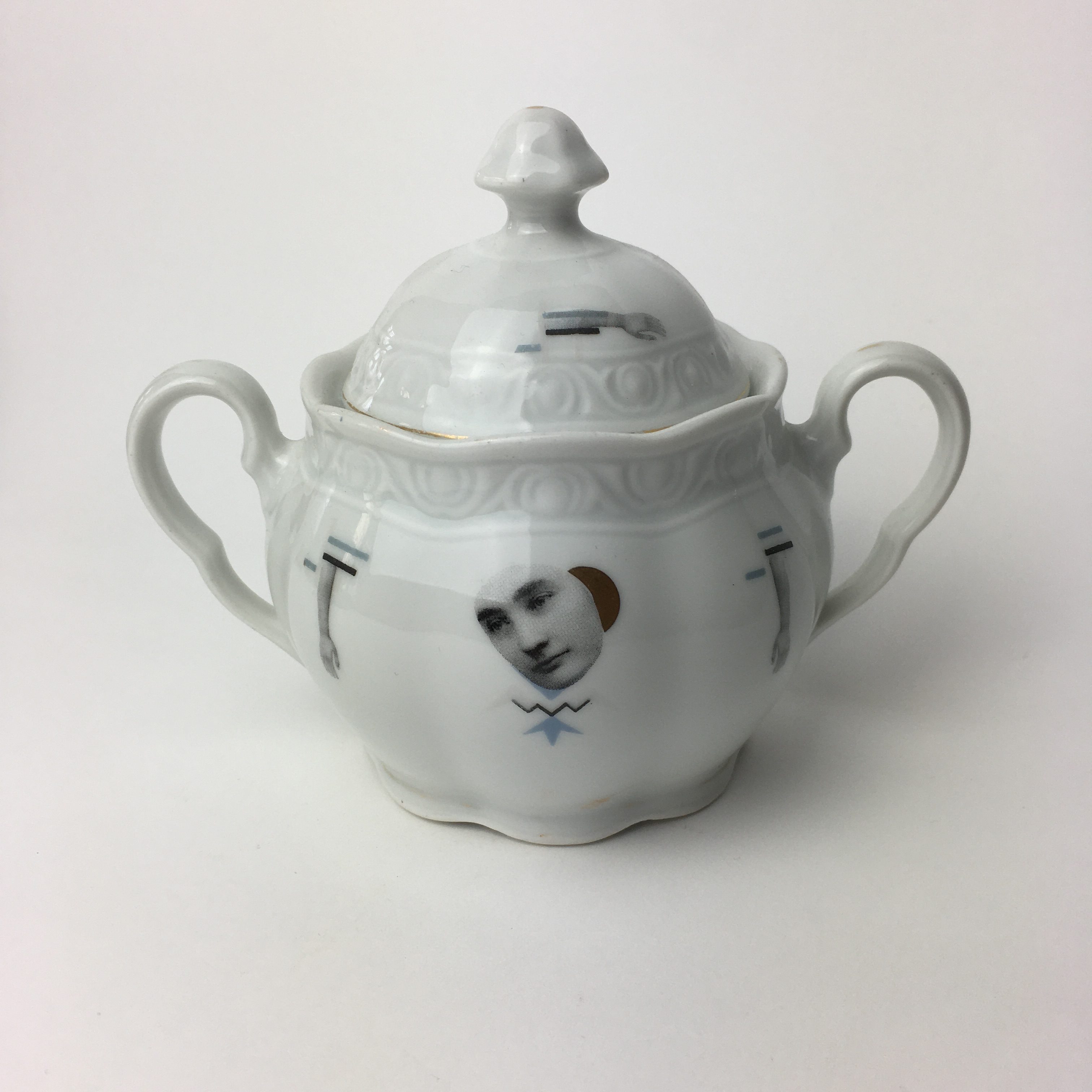 Old porcelain sugar can, hand drawn decoration, face of boys added illustration on each size.